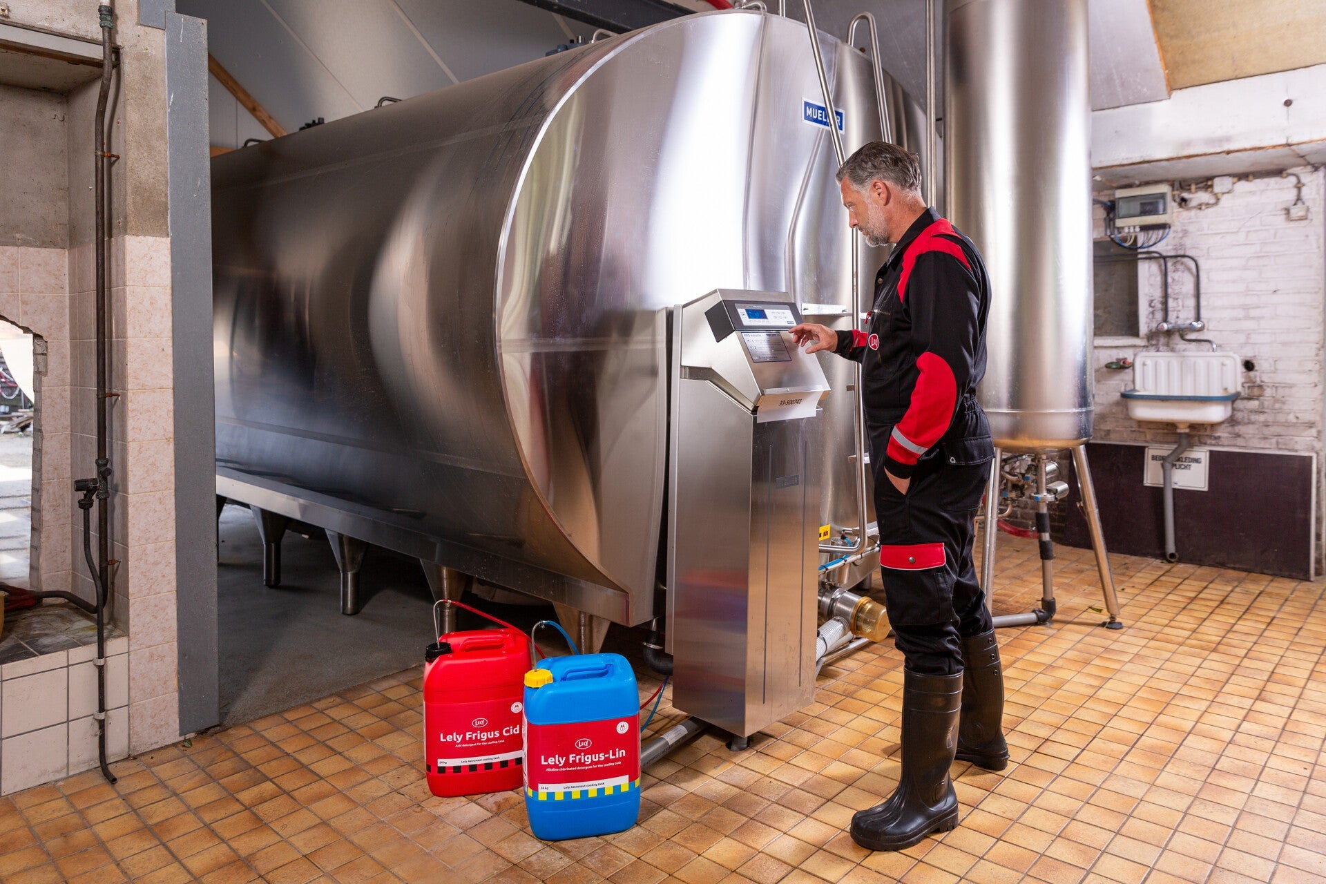 Ten behoeve van de alkalische reiniging wordt Lely Frigus Lin in circulatie reiniging toegepast bij een temperatuur van 50 tot 70 graden Celsius. Ondergrens van de reiniging is 45 graden Celsius. Bij de ingestelde concentratie (0,5-1,0%) en circulatietijd (3-10 minuten) vindt een effectieve reiniging plaats. Het aanwezige chloor geeft hierbij zowel een desinfecterend als reinigend effect. Een alkalische chloorhoudende reiniging vraagt een periodieke zuurreiniging.