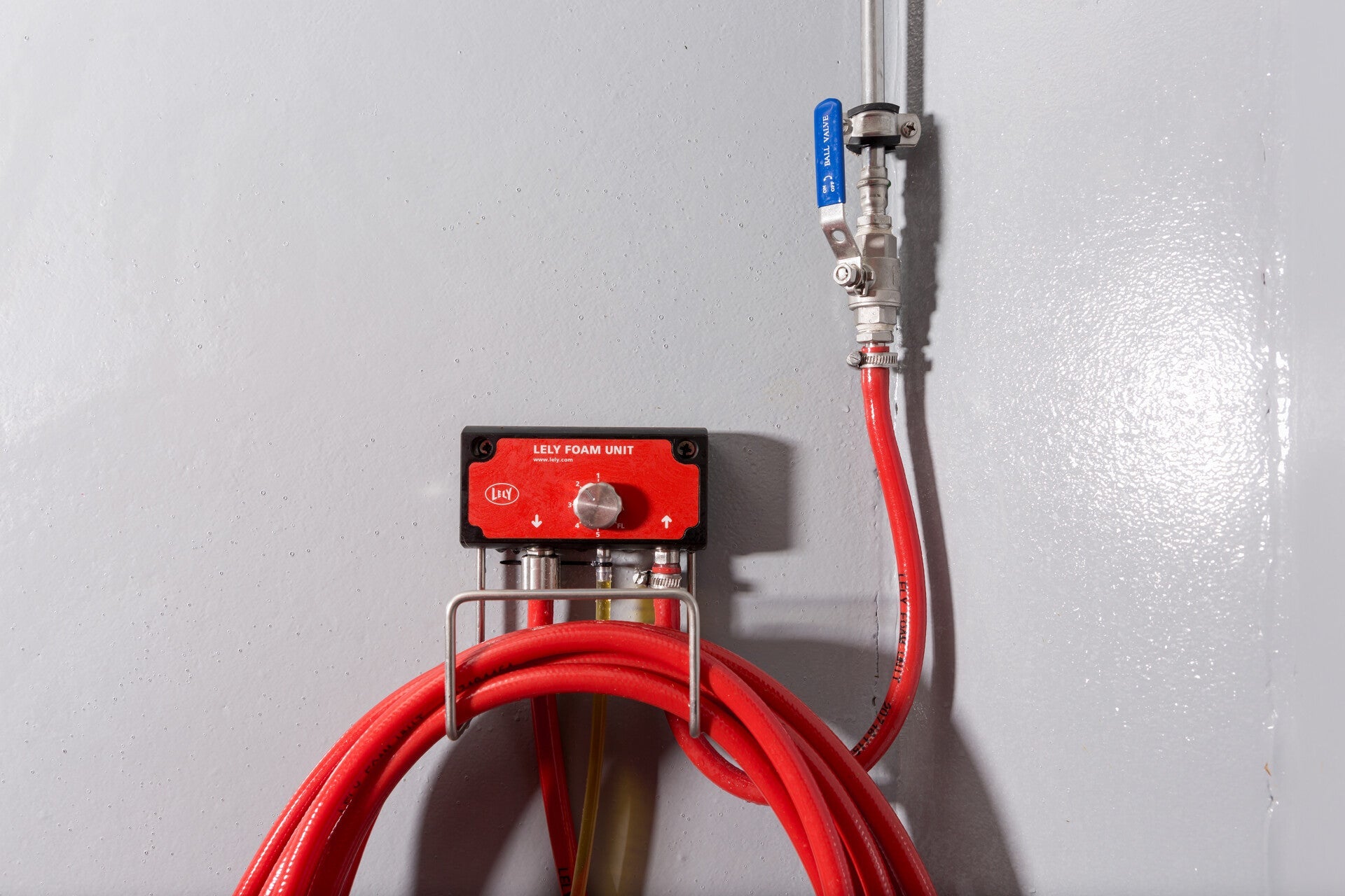 De Lely Foam Unit is een stevig, compact schuimsysteem bedoelt voor reinigingswerkzaamheden op het melkveebedrijf. De Lely Foam Unit is snel te installeren in elke stal of robotruimte en is eenvoudig in gebruik. De concentratie van het reinigingsmiddel is gemakkelijk in te stellen met de draaiknop. Zo is het mogelijk om voor elke soort vervuiling en te behandelen oppervlak de juiste concentratie te kiezen. Na gebruik wordt geadviseerd om de Lely Foam Unit door te spoelen met schoon water. De Lely Foam Unit wordt compleet geleverd met rode schuimslang, nieuwe verbeterde, stevige schuimkop en aanzuiglans (met filter en beschermdop) voor het reinigingsmiddel. De Lely Foam Unit is o.a. geschikt voor het reinigen van wanden en vloeren in de (melk)stal/robotruimte en de buitenkant van de Lely Astronaut melkrobot of andere melkinstallatie. De rode schuimslang heeft een lengte van 20 meter, daardoor zijn verschillende plekken goed bereikbaar. Tijdens gebruik wordt reinigingsmiddel constant aangezogen via de doorzichtige aanzuiglans en vermengd met leidingwater tot de ingestelde concentratie. De Lely Foam Unit produceert een dik, sterk schuim dat lang hecht aan het te reinigen oppervlak. De Lely Foam Unit is een zeer gebruiksvriendelijke lagedrukreiniger die enkel gebruik maakt van waterdruk.