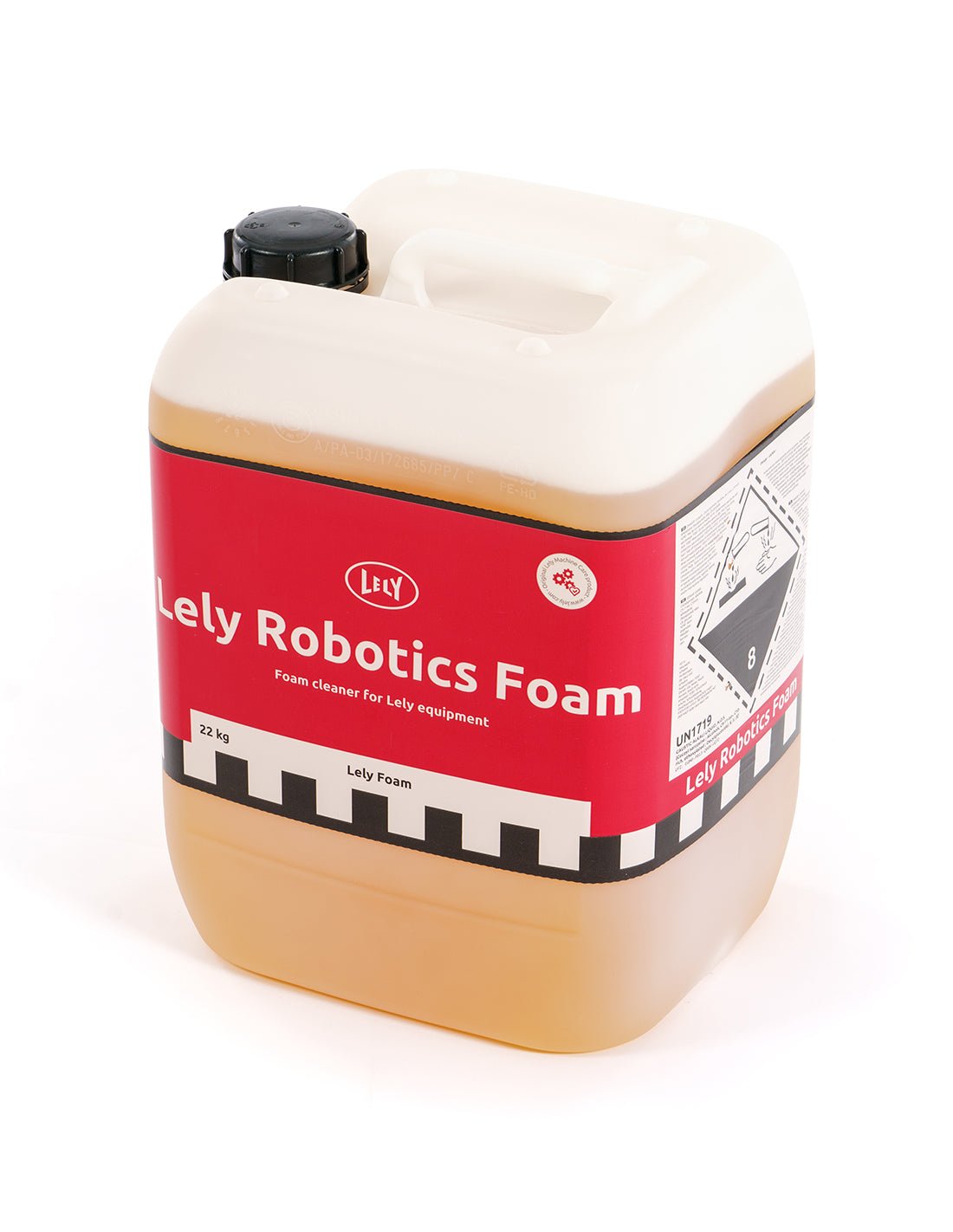 Lely Robotics Foam is een licht alkalisch, schuimend reinigingsmiddel. Door de milde samenstelling is het product veilig te gebruiken op kwetsbare materialen, zoals aluminium. De optimale ontvettende eigenschappen maken het schuim ook bruikbaar op machines en voertuigen. De frisse geur ondersteunt een optimale reinigingservaring. Lely Robotics schuim heeft een verbeterde kleefkracht, waardoor het product langer werkt, vooral op verticale oppervlakken. Vet, eiwit, mest en urine zijn typische verontreinigingen die moeiteloos kunnen worden afgespoeld. Dit product kan gebruikt worden in de Lely Foam Unit en andere lage en hogedruk (schuim)systemen.