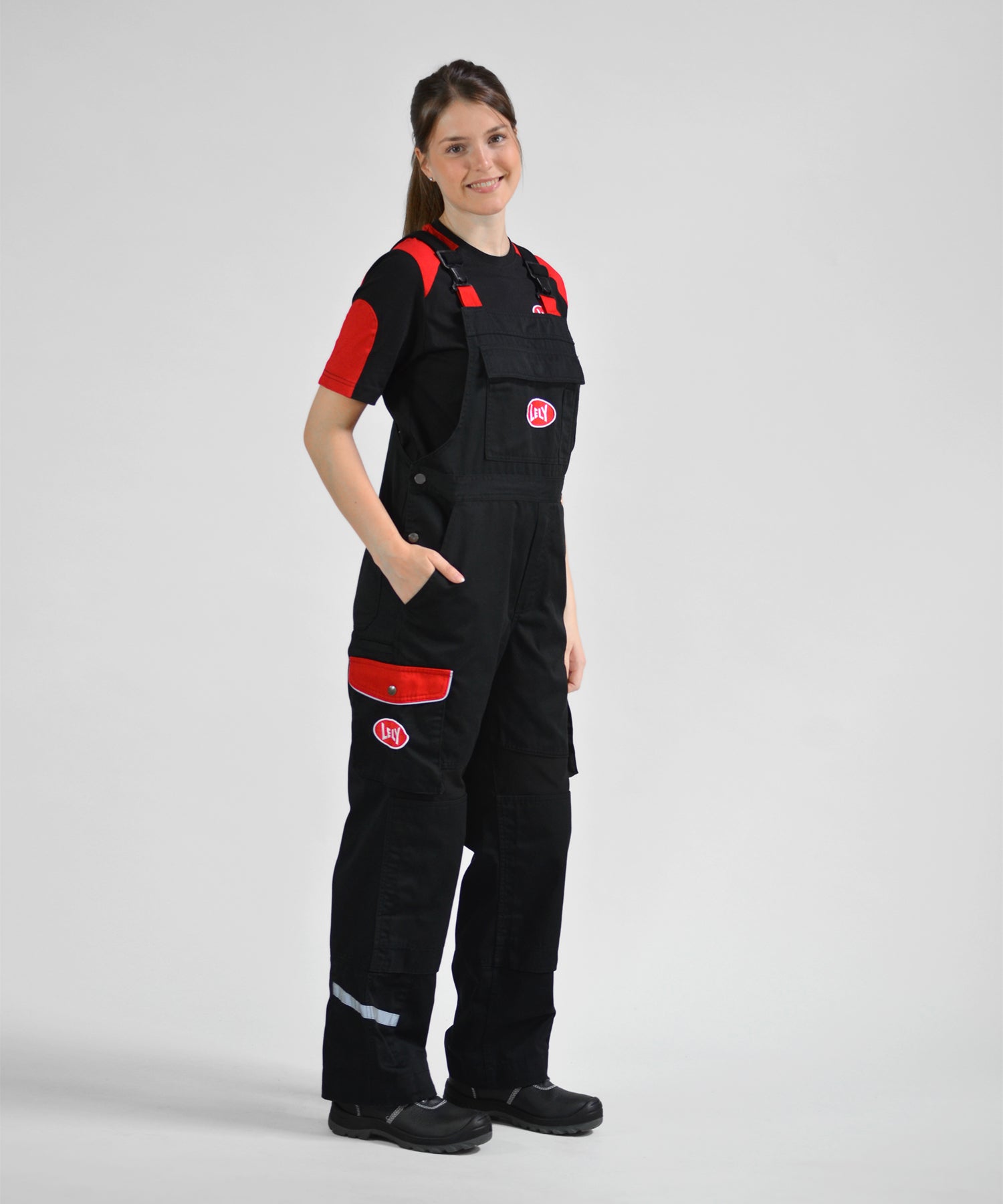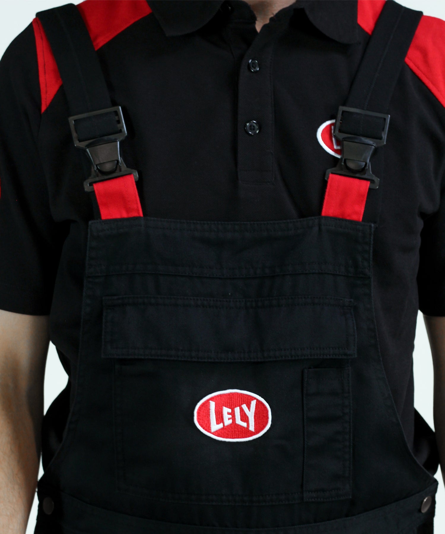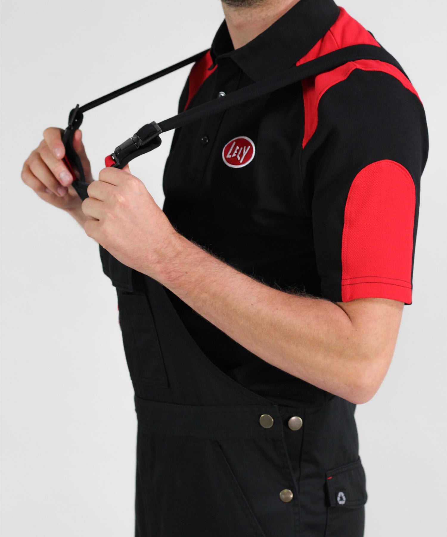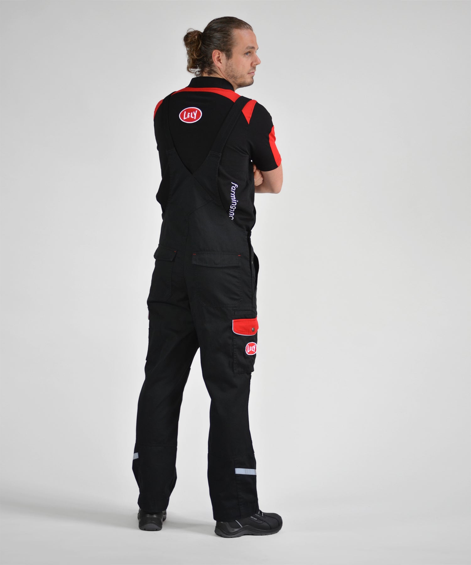 Deze duurzame zwart met rode amerikaanse overall is gemaakt van 65% recyclede polyester en 35% katoen. De elastische banden zijn eenvoudig te verstellen. De overall is voorzien van klepzakken op beide benen, een duimstokzak, steekzakken, achterzakken en 1 grote borstzak met rits. Om te zorgen voor extra bewegingsvrijheid is er rond de knieën stretch-stof toegevoegd. Er zit een Lely logo op de borst en zijzak. Reflectie biezen op meerdere plekken zorgt ervoor dat je goed zichtbaar bent.