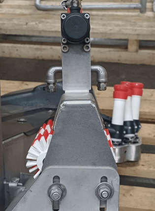 De sproeier die Lely op de A3 heeft ontworpen, had één sproeinozzle boven de borstels. Dit resulteert in te veel druk boven de borstels, waardoor er veel middel langs de borstels gaat en niet op de borstels terechtkomt.