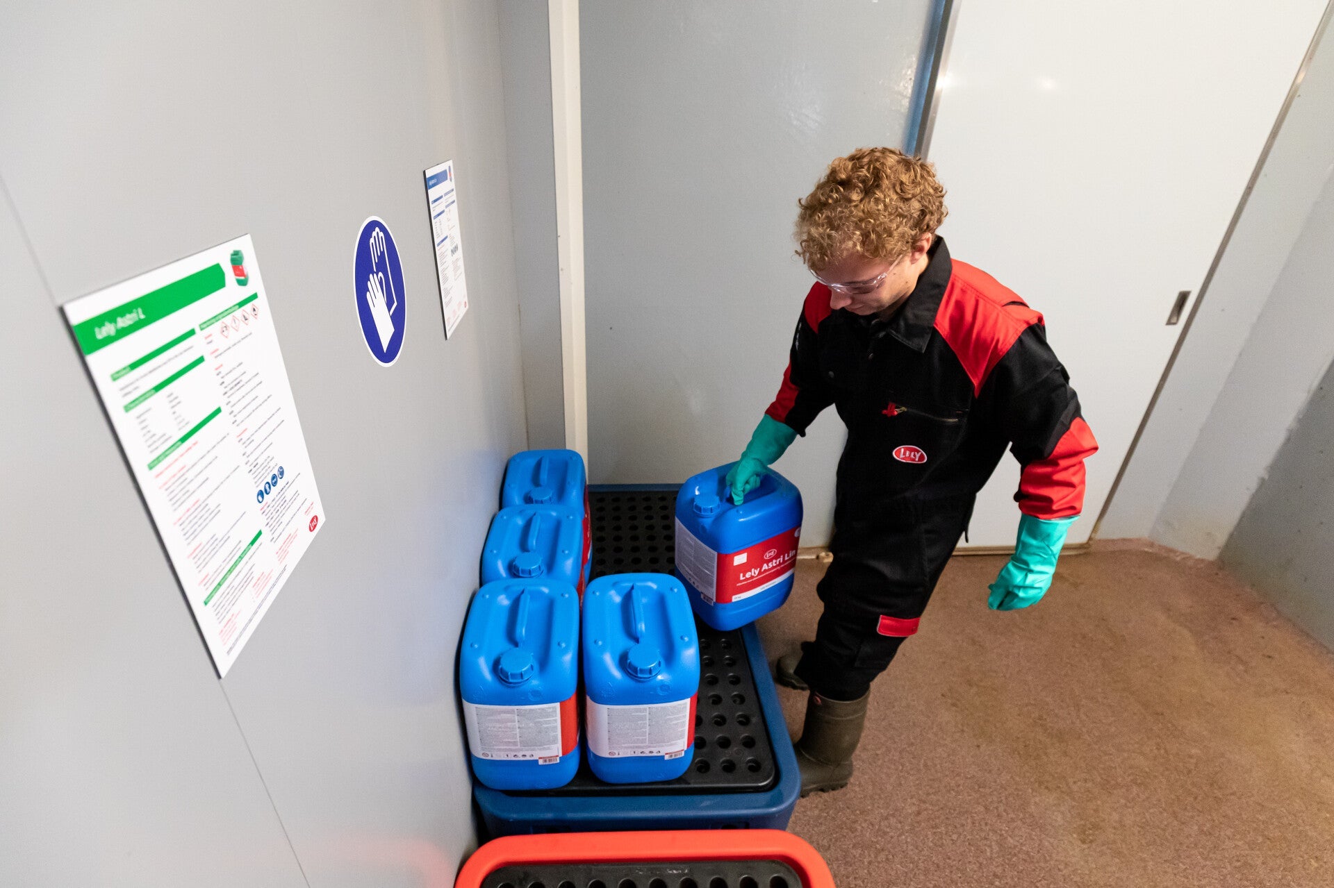 Denk hierbij aan een afgeschermde en donkere omgeving met vluchtroutes, constante temperatuur en ventilatie. Belangrijk is dat er een heldere, zichtbare identificatie en vaste allocatie van alle producten is. Zodat jij, maar ook je medewerkers nooit misgrijpen. Maak gebruik van lekbakken en chemiekasten voor de daarvoor bedoelde producten en hang Lely chemie kaarten met de veiligheidsinstructies op bij de producten. Zorg daarnaast dat alle hulpmiddelen aanwezig zijn zoals een oogdouche, persoonlijke beschermingsmiddelen, EHBO-voorzieningen, brandblusmiddelen en veiligheidsinformatiebladen. Houd je aan de nationale voorschriften en richtlijnen voor het opslaan van chemicaliën.