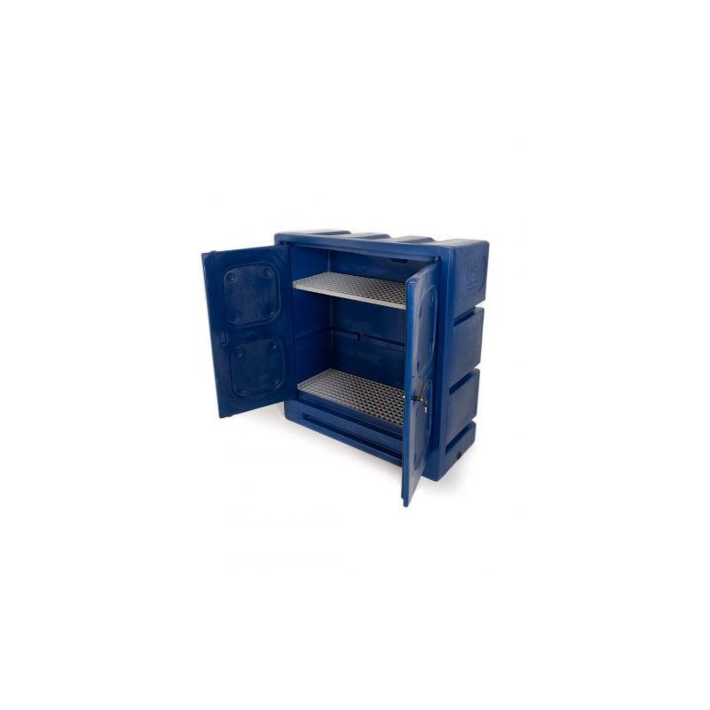 In de opslagkast voor chemicaliën kunnen kleinere chemische materialen en tools voor op melkveebedrijven veilig worden opgeslagen. De opslagkast voor chemicaliën bestaat uit een geïntegreerde lekbak en schappen. De lekbak heeft voldoende capaciteit om flessen of kleine blikken op te slaan. Houd u daarbij altijd aan nationale regels en richtlijnen voor het opslaan van chemicaliën. De opslagkast voor chemicaliën is verkrijgbaar in rood en blauw. Alkalische en zure producten moeten in aparte opslagkasten worden geplaatst, en de twee kleuren verwijzen dan ook naar de kleurcodes op de verpakkingen van Lely. De opslagkast en planken voor chemicaliën zijn volledig gemaakt van polytheen (plastic), zodat in geval van lekken of morsen geen corrosie kan optreden. Ook verlengt het gebruik van sterk polytheen de levensduur van opslagkasten voor chemicaliën, die daarmee een duurzame optie zijn. De deuren zijn voorzien van slot en grendel om te voorkomen dat niet-geautoriseerde personen de kast open maken.