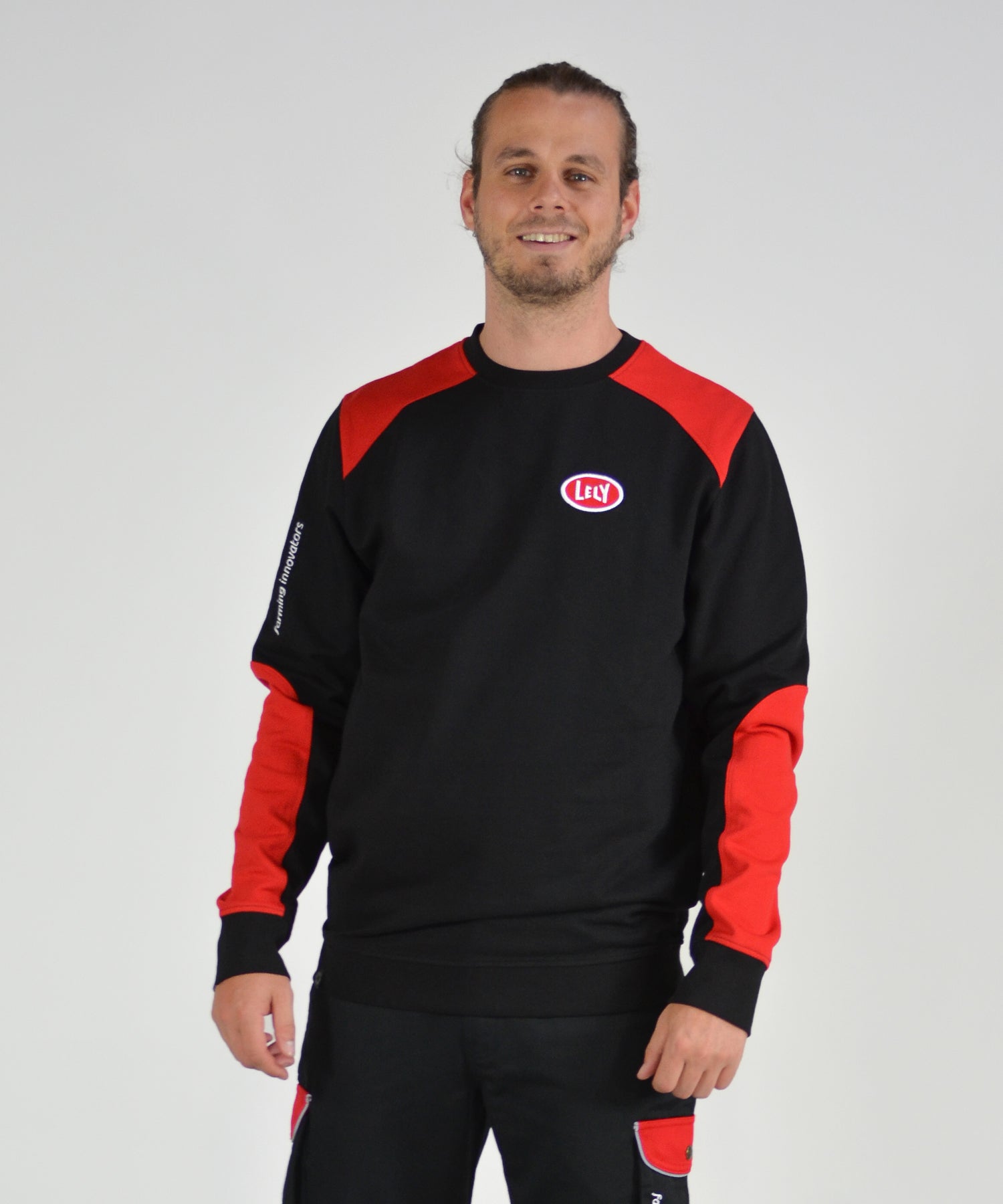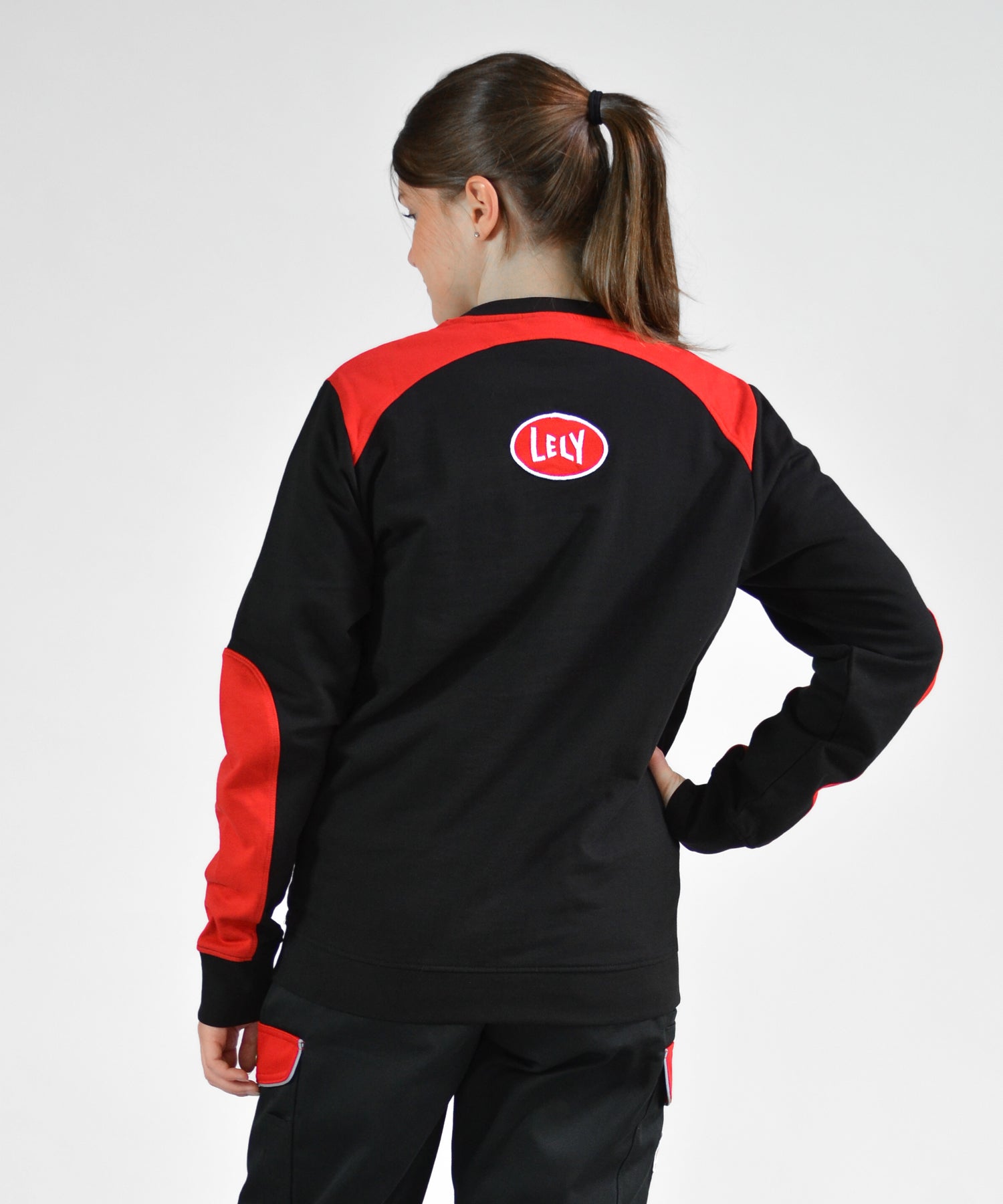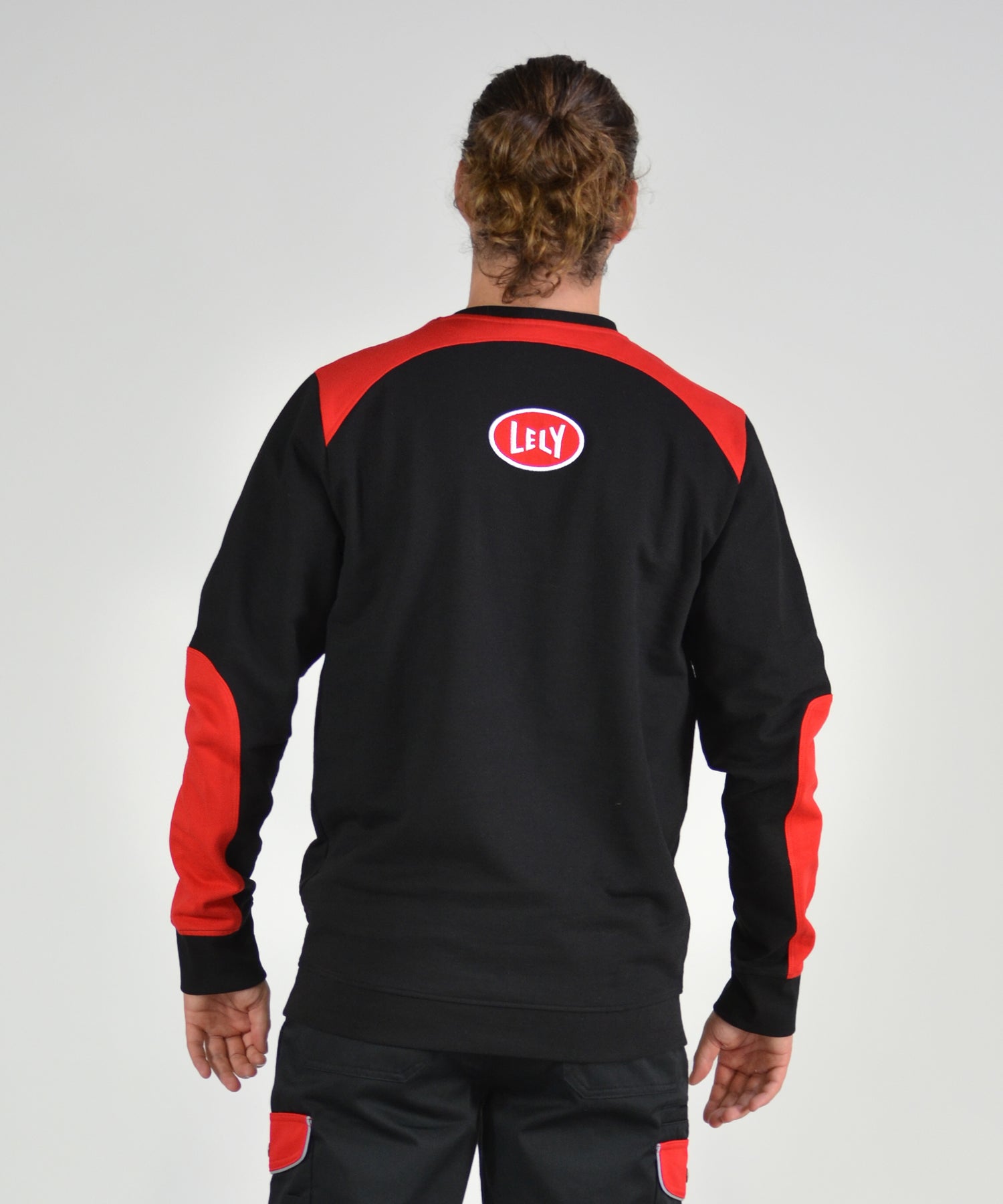 De duurzame Lely sweater/trui is gemaakt van 65% biologische katoen en 35% recyclede polyester. De sweater is zwart met meerdere rode accenten. Er zit een Lely logo op de borst en de rug.