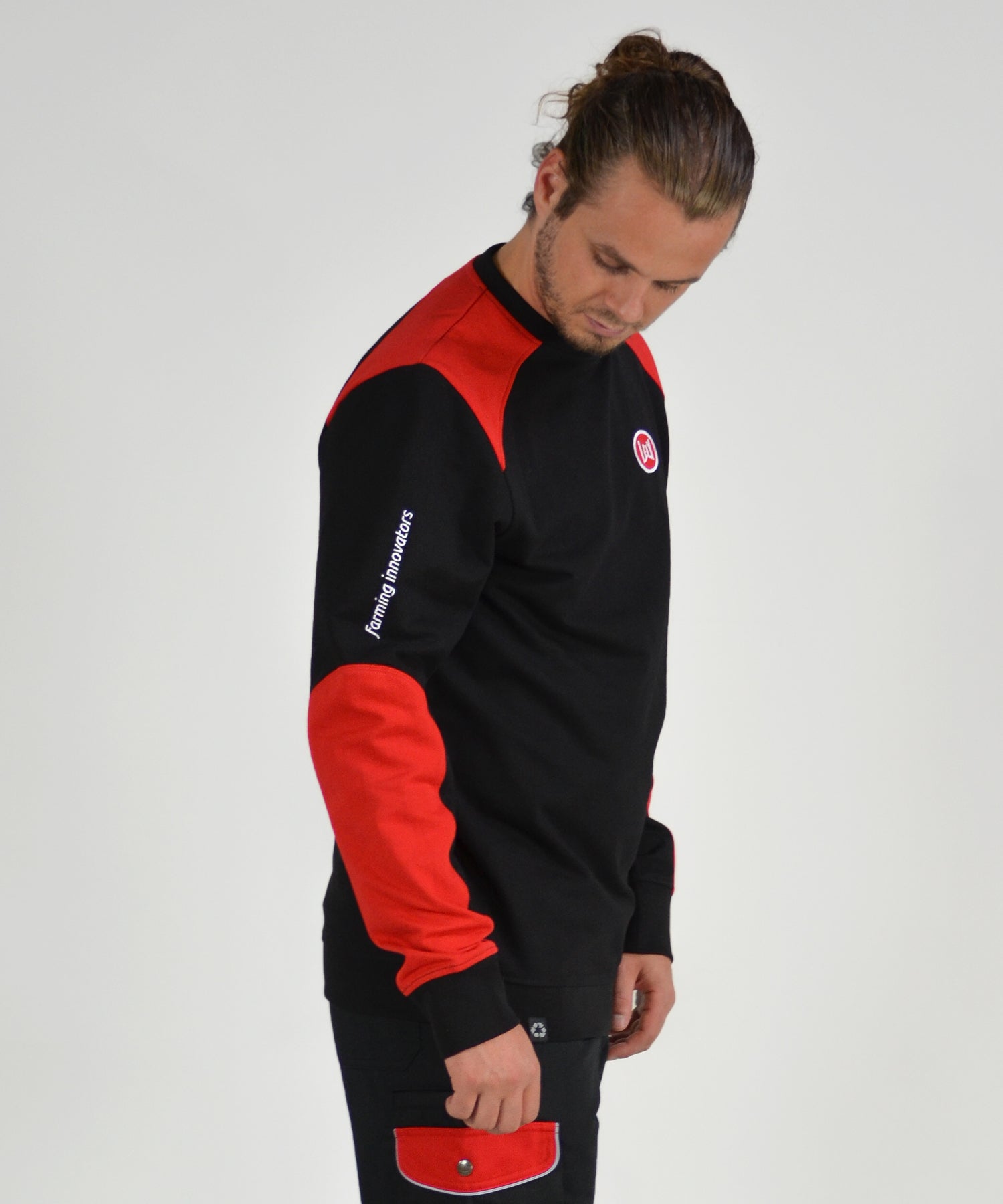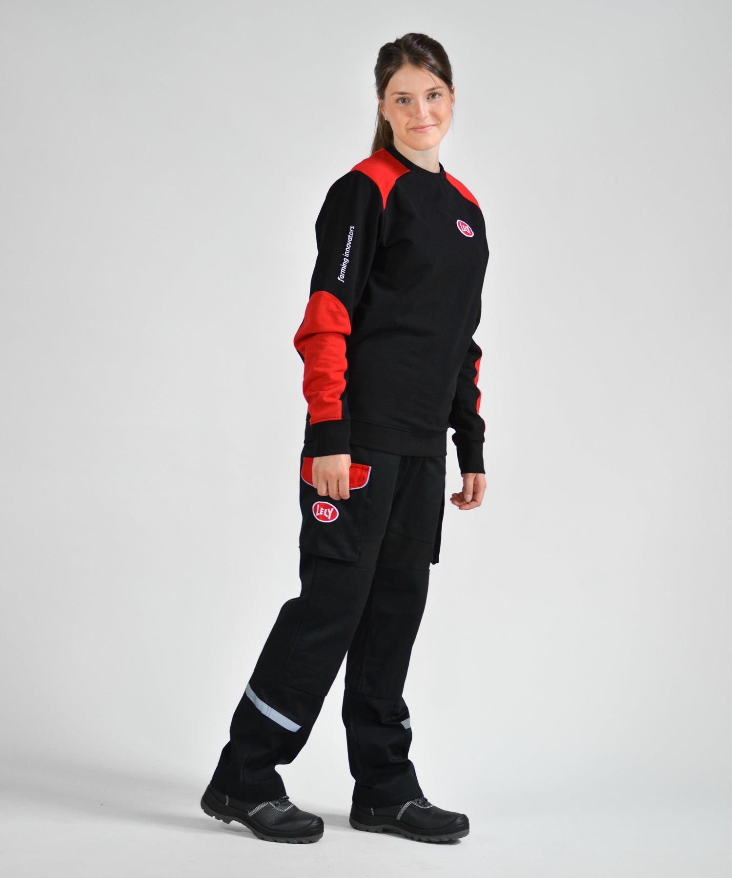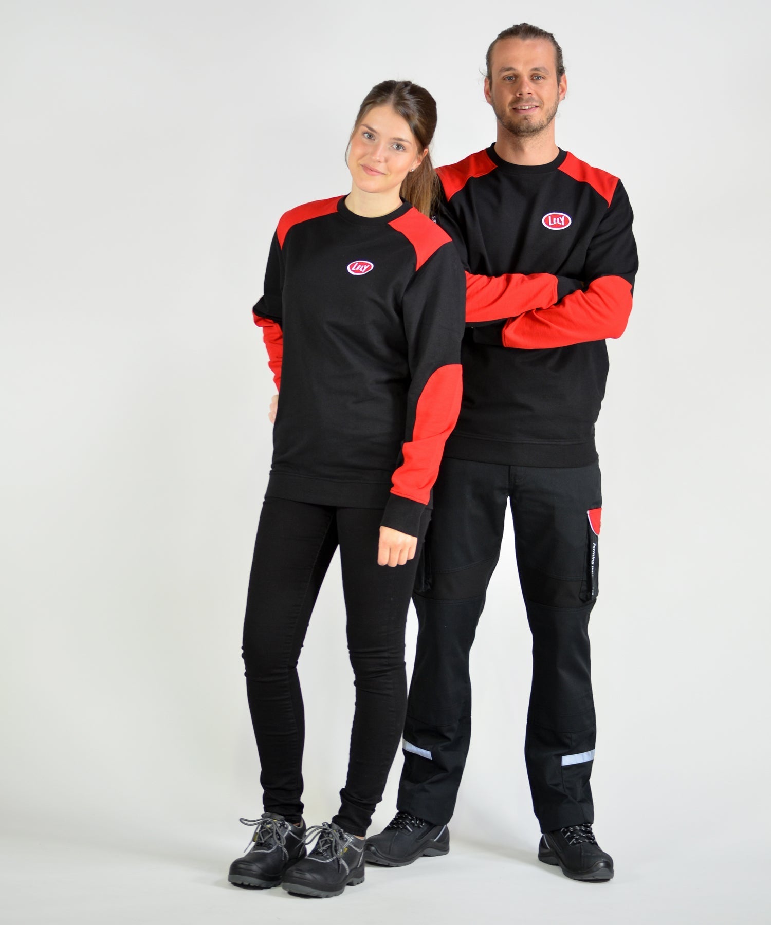 De duurzame Lely sweater/trui is gemaakt van 65% biologische katoen en 35% recyclede polyester. De sweater is zwart met meerdere rode accenten. Er zit een Lely logo op de borst en de rug.
