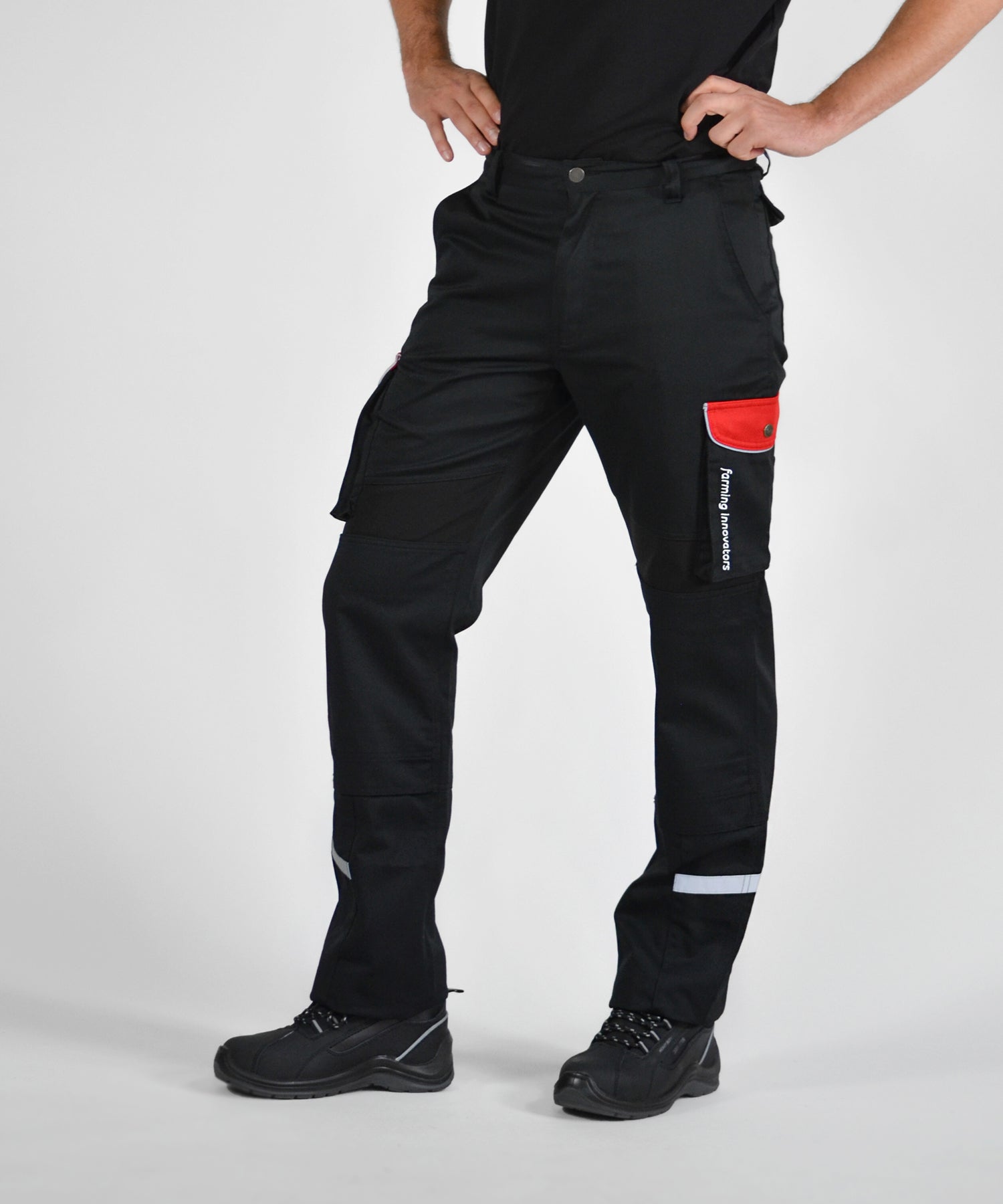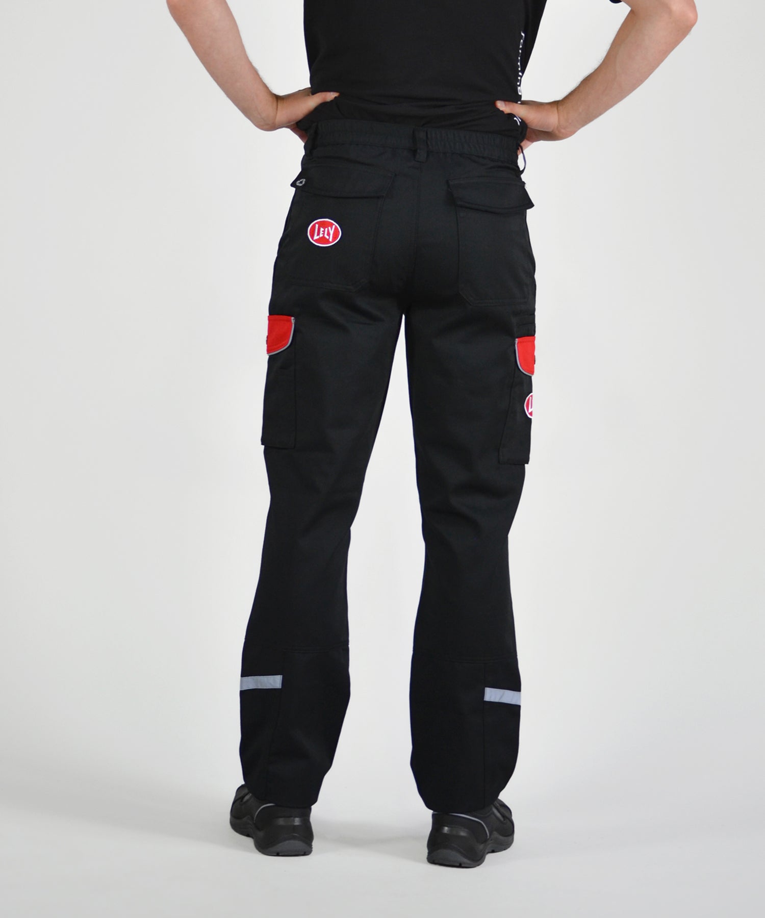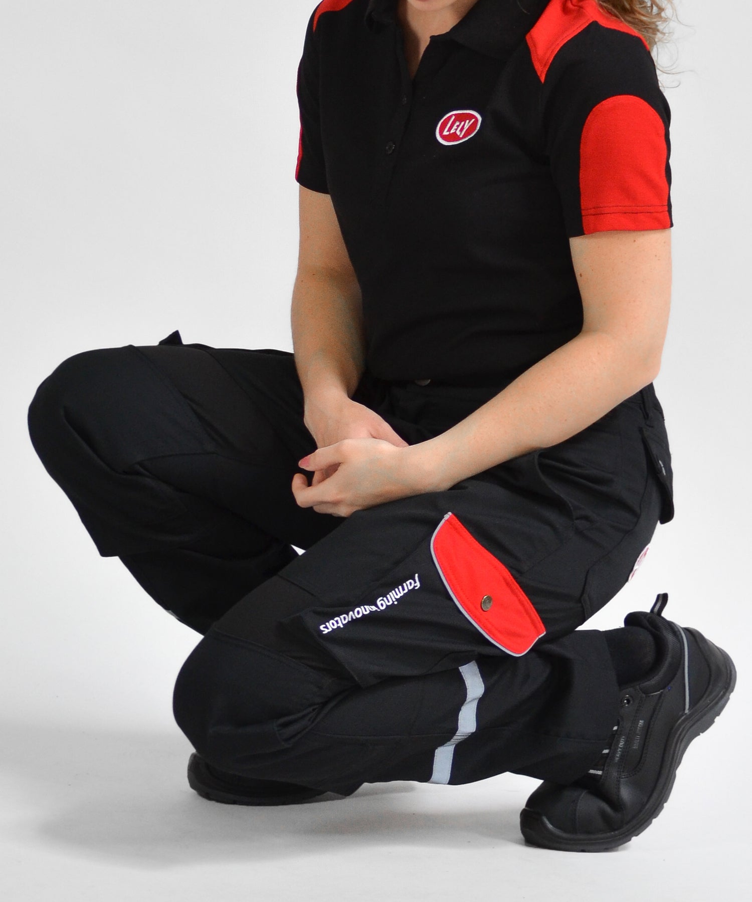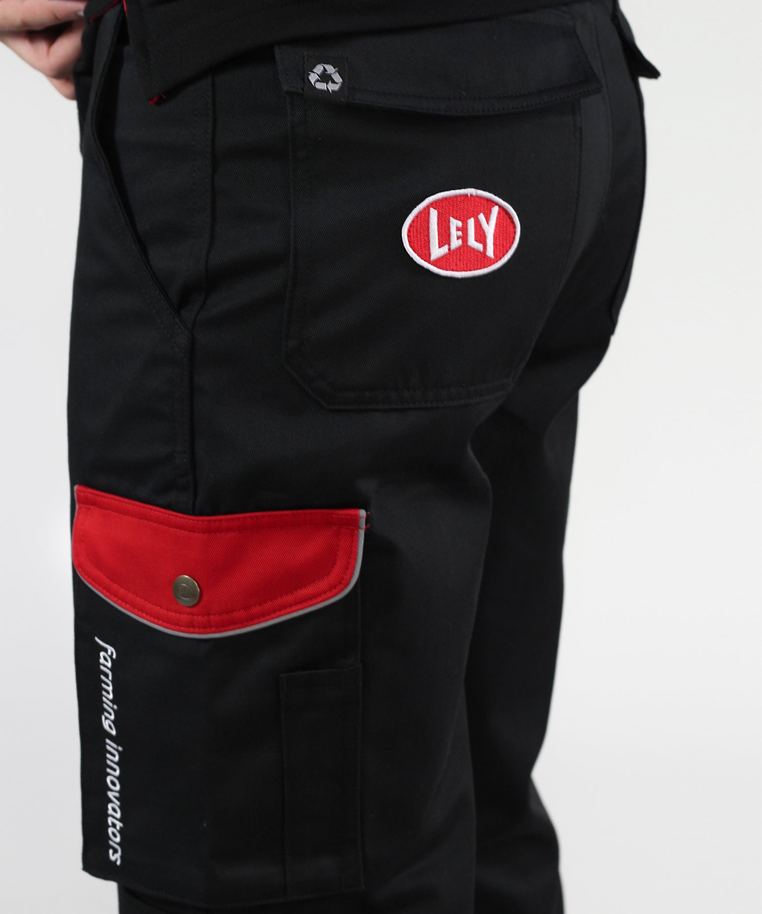 Deze duurzame werkbroek is gemaakt van 65% recyclede polyester en 35% katoen. De broeksband heeft elastiek in de achterzijde, zodat deze beter aansluit. Voorzien van zijzakken, achterzakken, een duimstokzak en steekzakken. Boven de knie is stretch-stof toegevoegd voor extra draagcomfort en op de knie zitten vakken om kniestukken toe te voegen. De achterzak en zijzak zijn voorzien van een Lely logo. Reflectie op de zijzakken en de onderbenen zorgen voor een goede zichtbaarheid.